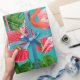 Flamingofågel, flamingoblomma, monstera löv och hibiscus målades med vattenfärger på pappra, skannades sedan och det sömlösa mönster gjordes i Photoshop.