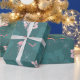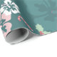 Flamingo Helgdag Wrapping Papper. Rosa, blått, Hibiscus Blommor med Lycklig Flamingos som håller Polkagrisar med en julhatt.