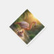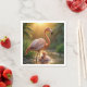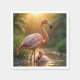 En stor flamingo står på ett skickligt sätt i grunda vatten, där hennes baby chick sitter bekvämt vid sidan av den.
