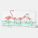 Mid-sekels inspirerade design med en återpekande med en grupp rosa flamingos som står i aqua vatten mot en vit bakgrund. Ett anpassade som du kan anpassa med egen text, bilder och egna idéer. En originalbild för digital konst skapat av Jess Perry på QuirkyChic Retro.