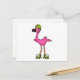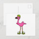 Flamingo som skateboardåkare med rullskridskor och vykort