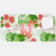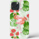 Vattenfärgsdesign i mönster med flamingoblommor och fåglar, monsterfärger och handflatan löv.