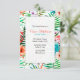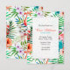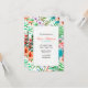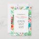 En strålande färgrik, handmålad, tropisk inbjudan med en frodig blom- och ormbunksbakgrund med rosa flamingos. Lämplig för nästan alla glada tillfällen.