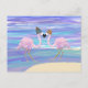 Illustration av två flamingos som står på en strand som ha på sig stack hattar.