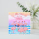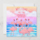 Flamingos på Parad Platt Greeting Card. En rolig partiförfrågan till din favorit flamingo-älskare. Tropisk natur, strand, fåglar, djur-inspirerad. Vattenteckning konstnärlig välkommen till familjen, adoption, underhållning, födelsedagsfirande eller andra evenemang. Behåll den humoristiska meningen "Välkommen till flocken!", ändra den och lägg till dina detaljer på insidan.