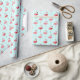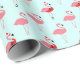 Noveltyns julomslutning papper med en mönster av rosa flamingos och även flamingos i tomten på blå bakgrund.