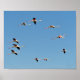 Flamingos under flygning (Phoenicopterus ruber) på bakgrunden till blå himmel, i Camargue är ett naturområde som ligger söder om Arles, Frankrike, mellan Medelhavet och de två armarna av Rhône delta