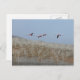 Flödesflamingor ovanför skogsfotot från silver som tagits på Galapagos-öarna. En grupp rosa flamingo som flyger över ett fint sjö.