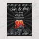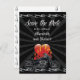 Slå den öppna vägen med ett spara datum meddelande för paret som handlar om den öppna vägen och deras cykel(er). En grafisk motorcykel med skisser accentueras av ett flammande hjärta mot en rik svart grungande bakgrund med en överkant och grund gräns av tunna kromlågor. All text är helt anpassade. Tillgängligt med matchande produkter.