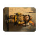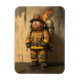 Bilden visar en karikatyrartad brandkåpa i skyddsutrustning för fullt, inklusive en orange brandsäker kostym, hjälm med ett R-emblem och syretank, som oväntat brinner. Tecknet har ett runda, vidögat ansikte med ett förvånat eller oroligt uttryck. Den painterliska stil, som påminner om Marius van Dokkums arbete, tillför en humoristisk och vismisk ton till scenen. Bakgrunden muteras med rökiga väggar, vilket ökar kontrasten mellan tecknets detaljerade kontur och det surrealistiska, ljusa humöret.