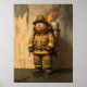Bilden visar en karikatyrartad brandkåpa i skyddsutrustning för fullt, inklusive en orange brandsäker kostym, hjälm med ett R-emblem och syretank, som oväntat brinner. Tecknet har ett runda, vidögat ansikte med ett förvånat eller oroligt uttryck. Den painterliska stil, som påminner om Marius van Dokkums arbete, tillför en humoristisk och vismisk ton till scenen. Bakgrunden muteras med rökiga väggar, vilket ökar kontrasten mellan tecknets detaljerade kontur och det surrealistiska, ljusa humöret.
