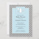Söta bilder i vitt om en flaska, en nappar, och en rattle avfärdar denna söta inbjudan till babydusch i baby blue och trendig grått.