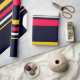 En geometrisk bakgrund med blå, röd och gult rand mönster.