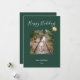 This is a modern, elegant holiday greeting card design featuring a deep forest green background. The top of the card displays the greeting "Happy Holidays" in a flowing, white calligraphy script. A distinctive, artistic brushstroke frame in the center holds a custom photo (shown here as a couple on train tracks), giving the image a painted, textured edge. A single, hand-painted style golden watercolor ornament hangs from the end of the script text, adding a festive metallic accent. The bottom of the card features clean, sans-serif white text reading "FROM OUR FAMILY" followed by a placeholder year "202x".