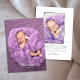 Meddela att du kommer till baby med vår elegant födelseattest, med ett lodrät foto av din lilla med det första namn som är vackert överlagt med ett vitt kalligrafiskt skript. Du kan anpassa meddelandet med ditt baby mitten och efternamn. På baksidan finns det utrymme för ytterligare bild, födelsestatistik och ett personligt budskap.