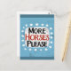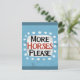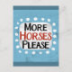 "Fler hästar, tack" är en söt textdesign i blått med svart och röd text, tillsammans med en vit accentform och vita texturerade vita prickar runt den.
