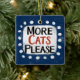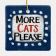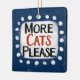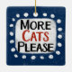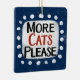 "Fler katter, tack" är en söt textdesign i blått med svart och röd text, tillsammans med en vit accentform och vita texturerade vita prickar runt den.