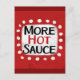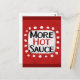 "Mer Hett Sauce" är en söt textdesign i rött med svart och röd text, tillsammans med en vit accentform och vita texturerade vita prickar runt den.