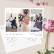 Denna enkelt eleganta gratulationskortsmall för bröllop med tre foton har en elegant, minimalistisk och modern design. Framsidan visar era förnamn och datum under era tre favoritfoton och ett "KÄRLEK och TACK" meddelande som förmedlas med en slående kombination av två olika typsnitt, där "och" skrivs med en lätt, flödande handskrift mellan de andra två orden, som står med versaler och har ett djärvt, skarpt formellt utseende. "KÄRLEK och TACK"-delen av designen är svart och kan inte ändras. När du redigerar framsidan för att visa era egna namn och datum kan du ändra textens färg till en viss färg eller något annat istället för den förvalda något mjukade svarta färgen, enligt din smak.