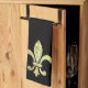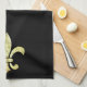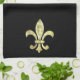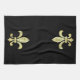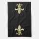 16" x 24" den svart kökshandduken med en avbilda på båda avslutar av en bladguld fleur de lis. Se att matcha trasaservetten, den pappra coctailservetten, trasabordstablett, papper bordstablett och underlägg. Se den hela Cancankökshandduksamlingen i linnena för FOOD/BEV | dela upp.