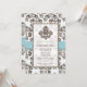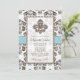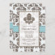 Nätt guld fleur de lis inbjudningskort för möhippan med en hjärta och en kontrast syr aquablått och bruntbanddesignen och den litet bekymrade mörkbruntet och den damastast gränsen för vit. Konstverk och design© Chrissy H. Studio, LLC. All reserverad rättigheter.