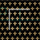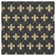 Guld- fleur de lis tyg med blommor på svart bakgrund.