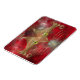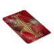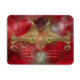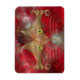 En stiliserad katt ansikte, som är gjord av glödande guld kurvor och kurvor, med bred grönt-guld öga, mot en röd rambakgrund.