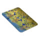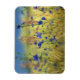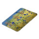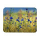 Levande blåcikoria och kornblommor blommar i en gyllene fält av gräs under en blek blå himmel. Även blondens och gröntens bakgrund avbryts av den mousserande rosan av gräblommor.