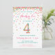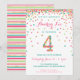 Fira din 4-årings födelsedag med färgglada guld-, rosa-, mint- och teal-konfetti på dessa 4-års inbjudningar! Med din dotters födelsedagsdetaljer och en "4" i konfetti. Rubriken lyder "HIP HIP HOORAY!" Söta färgglada ränder på baksidan.