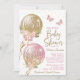 Ballong baby shower-inbjudan med fina rosa och guld ballonger med blommor, fjärilar och slingor på en vit bakgrund. Denna söta rosa och guld baby shower-inbjudan är lätt att anpassa med dina evenemangsuppgifter. Du kan också ändra bakgrundsfärgen på denna bedårande rosa och guld baby shower-inbjudan.