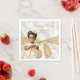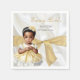 Vackert baby i en döpande klänning på en vit satängbakgrund med guld-band.