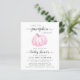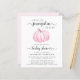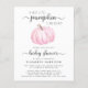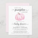 En söt, glad och budgetvänlig inbjudan till flicka barnkalas per post med "En söt liten pumpa är på väg" skriven i en blandning av modern, mjuk grå typografi och stilfullt skrivsätt, samt en pastellrosa akvarell av en pumpa. Anpassa mammas namn och kalasdetaljer i enkel grå typografi.