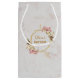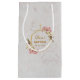 Denna eleganta blomstergeometriska dopgåvpåse, som rekommenderas som doppresent eller dopgåva till flicka, har i mitten, på båda sidor, en oregelbunden guldbord med blomsterbuketter av vita och rosa orkidéer uppåt till höger och ned åt vänster över två sexhörningar i guld som överlappar en vit marmorerad bakgrund, med ett guldkors högst upp. Barnets namn är skrivet med en elegant kalligrafisk skrift. All text har en gyllengul färg, likt guldbordet. Bakgrunden är vit marmor. Den antika blomsterbuketten med rosa och vita orkidéer är från ett gammalt vykort av Bertha Maguire (1862-1910), numera i public domain.