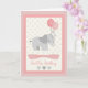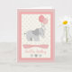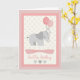 Det här flicka-kortet har en grått-elefant med två rosa-ballonger och en ljus rosa polka-punktbakgrund. Under elefanten är en rosa bucka med texten "hej baby" och tre grått hjärtan.