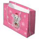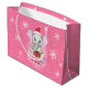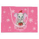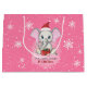 En berömvärd flicka-elefant med julhatt, en julklapp, en käpp-godis och en snöbakgrund med vackert snöflingor. Flicka första julen Helgdagar. Anpassa genom att byta namn.