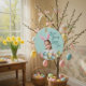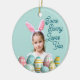 Tjejfoto med roliga påskharens öron och målade ägg på blå bakgrund på din egen påskkeramikprydnad. Kan vara ett minne för dig själv eller en personlig gåva till en vän eller familjemedlem. Generativt innehåll kan ändras. Humoristiskt hälsningsfras "Some Bunny Loves You" på prydnadens framsida och på baksidan syns hälsningstexten. Om du ersätter tjejfotot med ditt eget, använd då alternativet "ta bort bakgrund" från redigeringsmenyn.