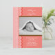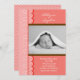 Ett modernt och djärvt födelsemeddelande för en flicka. Koral bakgrund med stort "tillkännagivande" av ord och polka dots accent. Lägg till ett eget foto och ord.