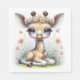 En söt baby giraffe med stort blått ögon bär en blomma krona och är omgiven av rosa blommor och fjärilar