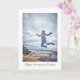 Ett gratulationskort med en kvinna som hoppar av glädje från några stenar på en strand. Hennes armar och ben är delvis utsträckta, vilket gör det till ett krabbhopp. Hon har en tjock jacka mot kylan och hennes hår lyfter i vinden. Med en glad min och stora ögon är det övergripande intrycket av vild hänryckning.