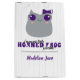 Känner du till flicka på vägen? Ska jag vara en groda? Den här söta designen görs i lila och grått med en adabel flicka horngroda - komplett med båge. Stor groda på framsidan med ställe för hennes namn med en upprepad mönster av grodan på baksidan.