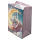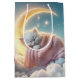 En söt baby-vit kattunge är täckt i en rosa filt och vilar fredligt på en glödande krescent måne i en drömmarkväll himmel