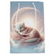 En söt baby-vit kattunge är täckt i en rosa filt och vilar fredligt på en glödande krescent måne i en drömmarkväll himmel