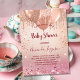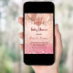 För en babydusch, fira en flicka. En övertoningsbakgrund för ro guld och rosa. Dekorerad med ro guld, rosa droppar, färgdroppstift och ballonger. Anpassa och lägg till närmare uppgifter om namn i mamma och party. Namn och texten: Baby Shower är skrivet med ett handskript i stil