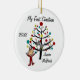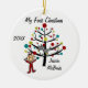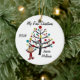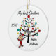 En söt runt keramiskt keepéjulprydnadsföremål har en stick figur-flicka i en röd slimare framför det dekorerade Julgran som katten är i, och områden där du kan lägga till helgdag, inklusive innevarande år och barnets namn. Det här är en bra gåva till alla flicka som firar sin första jul!