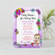 Lila var flickans inbjudningar till babyduschen. Söt lilla hand plockade-blommigt flicka som håller en nalle omgiven av blommor av lätt färgad söt. Baksidan är en färglös maska av vitaktiga konstblommor från stil i rött, lila, rosa, blått, teal och gult.