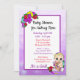 Lila var flickans inbjudningar till babyduschen. Söt lilla hand plockade-blommigt flicka som håller en nalle omgiven av blommor av lätt färgad söt.
