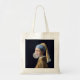 Flicka med pärlörhänge som blåser en bubbelgummibu tygkasse