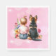 Babyduschservetter. Söta flicka sitta bredvid hennes lilla tyska schepherd i ett plåster med söt vattenfärgblommor. Rosa och blå fjärilar och vilda sötter.