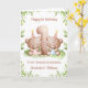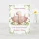 Det här födelsedagskortet är lämpligt för tvillingflicka och -pojke. Designen inkluderar en akvarellgrönsaklig rand, siffran 1 och två bruna teddybjörnar med födelsedagsballonger och födelsedagshattar.
