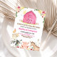 Fira din lilla enes stora dag med denna söta rosa barngårdsfödelsedagsinbjudan med en charmig samling lantdjursfigurer. Denna fantasifulla design visar en söt ko, gris och får samlade vid en rustik röd lada, perfekt för en tjejens lantbruksfest. Anpassa enkelt texten för att inkludera alla dina evenemangsuppgifter för en professionell finish av hög kvalitet. Dina gäster kommer att älska detta söta och färgglada "ner på gården"-tema som sätter scenen för en minnesvärd fest!